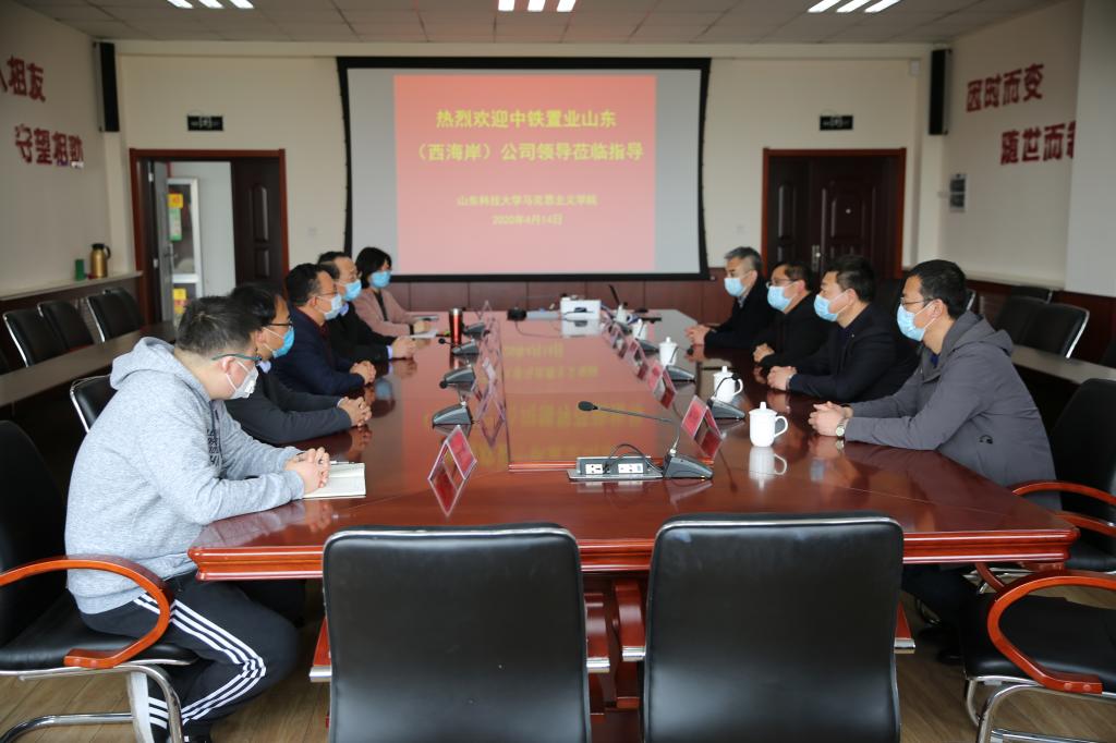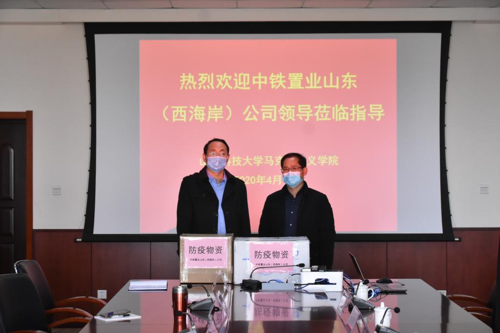 4月15日上午,中铁置业山东(西海岸)公司党委书记、执行董事段国杰,党委副书记、纪委书记、工会主席陈建国,党群工作部部长、人力资源部(党委干部部)部长韩云峰,党群工作部副部长兼工会办公室副主任杨玉炜,党群工作部主管王云龙一行5人来院捐赠口罩、消毒液等防疫物资,学院党委书记徐波代表学院接受了捐赠,院长逄奉辉、副院长邵勇与部分教师代表同客人进行了座谈。