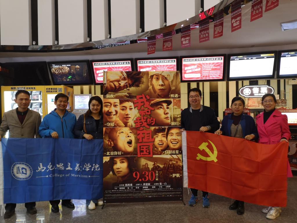 为庆祝中华人民共和国成立70周年,进一步推进“不忘初心、牢记使命”主题教育,激发党支部全体教师的爱国热情,深入贯彻落实“立德树人”的根本任务,道德与法治教研部党支部在beat365平台唯一官网党委的统一安排下,于2019年10月16日晚集体观看了庆祝新中国成立70华诞献礼大片《我和我的祖国》。