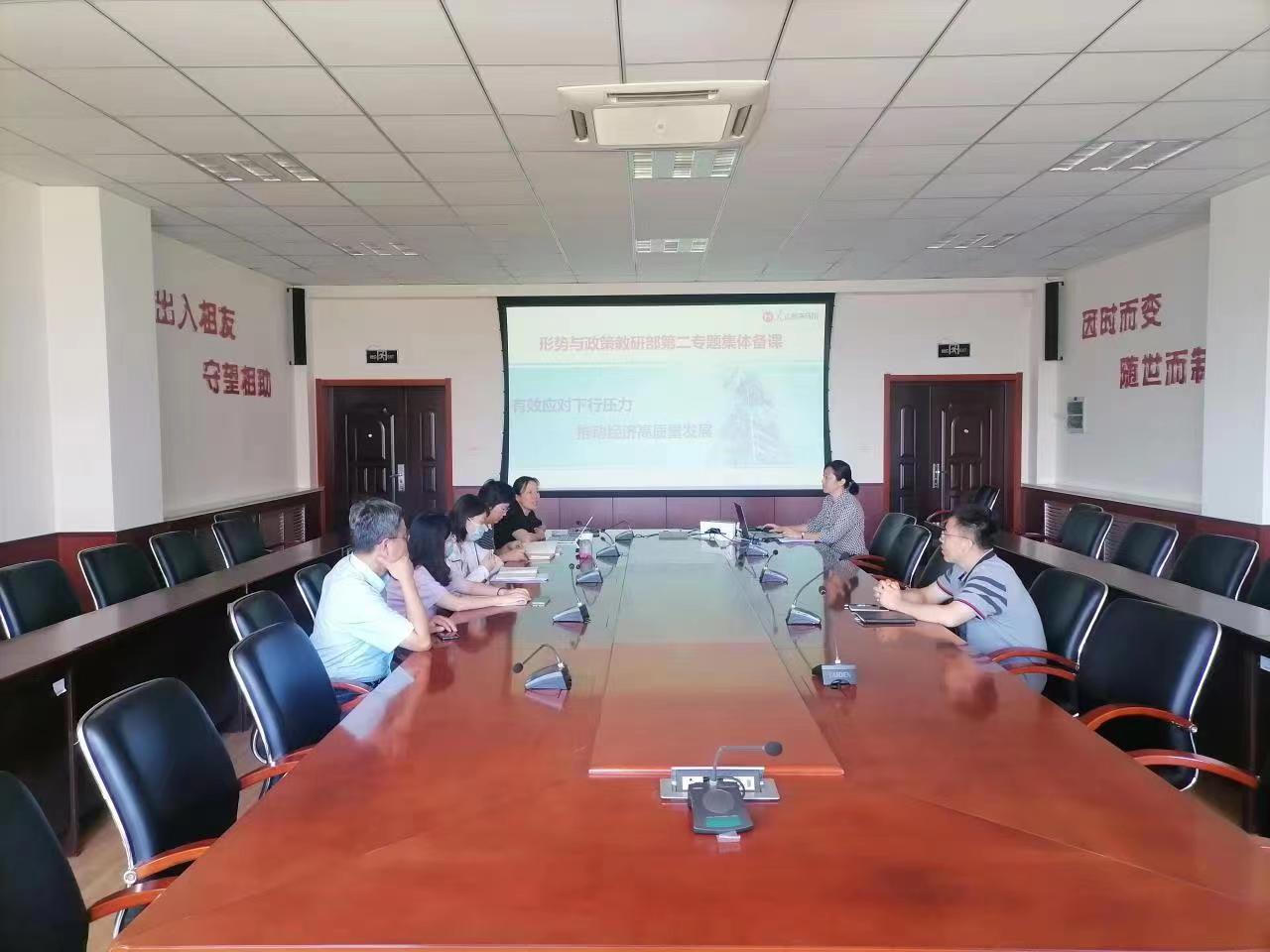 孙老师主讲内容为本学期形势与政策课第二专题《有效应对下行压力 推动经济高质量发展》,从当前我国经济面临多重压力、我国经济压力背后的深层次逻辑、坚定对我国经济发展前景的信心、多措并举推动经济高质量发展四个方面阐述如何在复杂外部环境叠加国内疫情多点散发的形势下,充分调动中国经济发展的强大韧性和活力,坚持稳字当头、稳中求进,推动经济社会高质量发展。引导学生理解高质量发展蕴含着深刻的辩证唯物主义和历史唯物主义的科学思维方法。任老师就当前国内经济形势以及国内外影响经济发展的因素进行讲解,帮助教研部老师深入理解本专题内容。