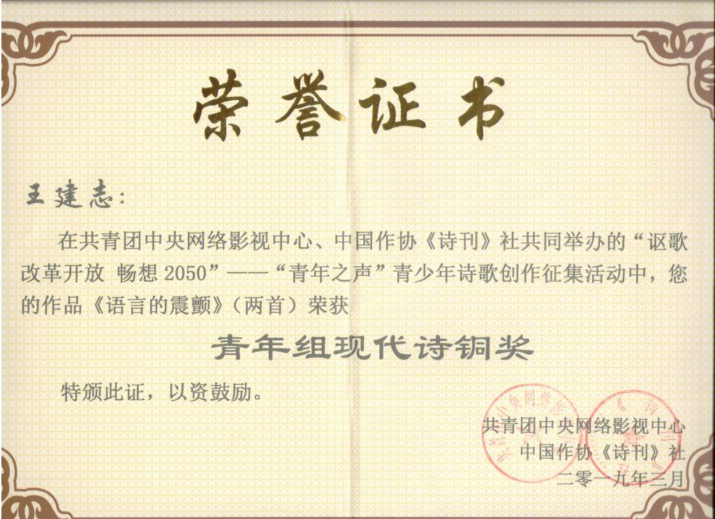 我院教师王建志的诗歌作品《语言的震颤》获团中央网络影视中心与诗刊社联合主办的“讴歌改革开放 畅想2050——‘青年之声’青少年诗歌创作征集”铜奖。