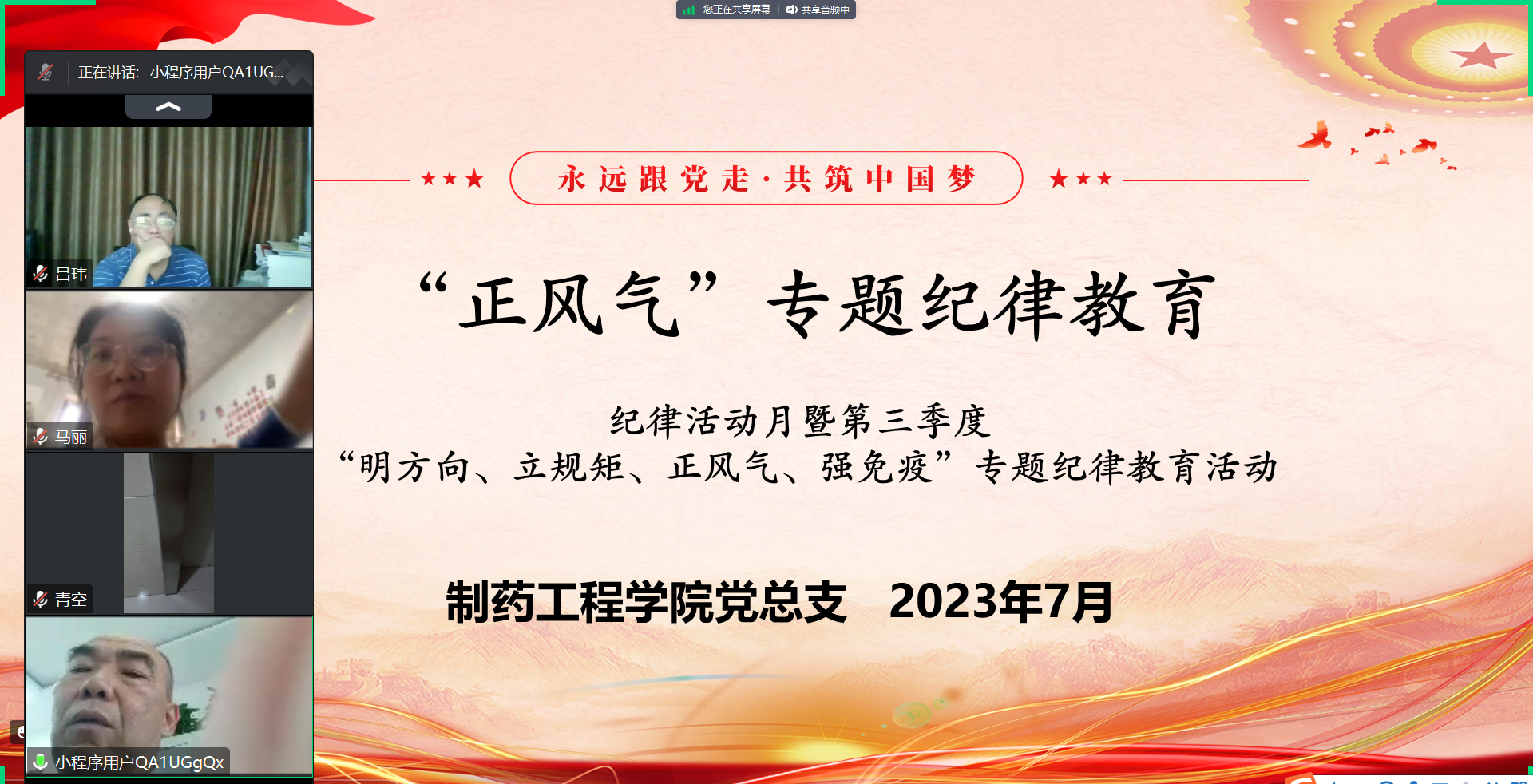 为深入贯彻党的二十大精神,落实关于一体推进“三不"、 廉洁文化建设和家风建设精神,强化党员干部的纪律、责任意识,切实筑牢拒腐防变思想道德防线,加强思想道德和党纪国法教育,推进廉洁文化建设,营造风清气正的教育教学环境,根据学校纪律检查委员会纪律教育活动月相关要求,7月23日,制药工程学院党总支组织开展了“正风气”专题纪律教育活动。会议由党总支书记窦传斌主持,学院全体党员线上参加了学习。