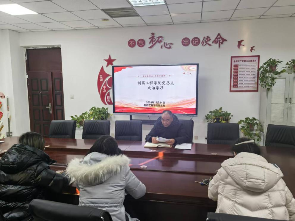 根据学校党委宣传(统战)部安排,制药工程学院党总支于2024年12月24日下午在301党员活动室开展政治理论学习专题会,会议由学院党总支书记窦传斌主持,全体教职工参加学习。