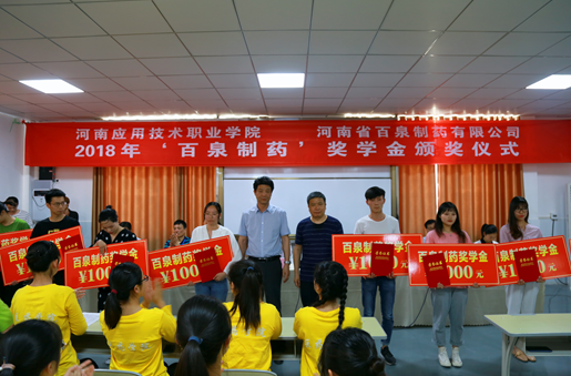 我院有6名同学获得“百泉制药”奖学金。在“百泉制药”奖学金颁奖仪式上,河南省百泉制药有限公司总经理与副总经理共同为获奖学生颁发了2018年度“百泉制药”奖学金与证书。
