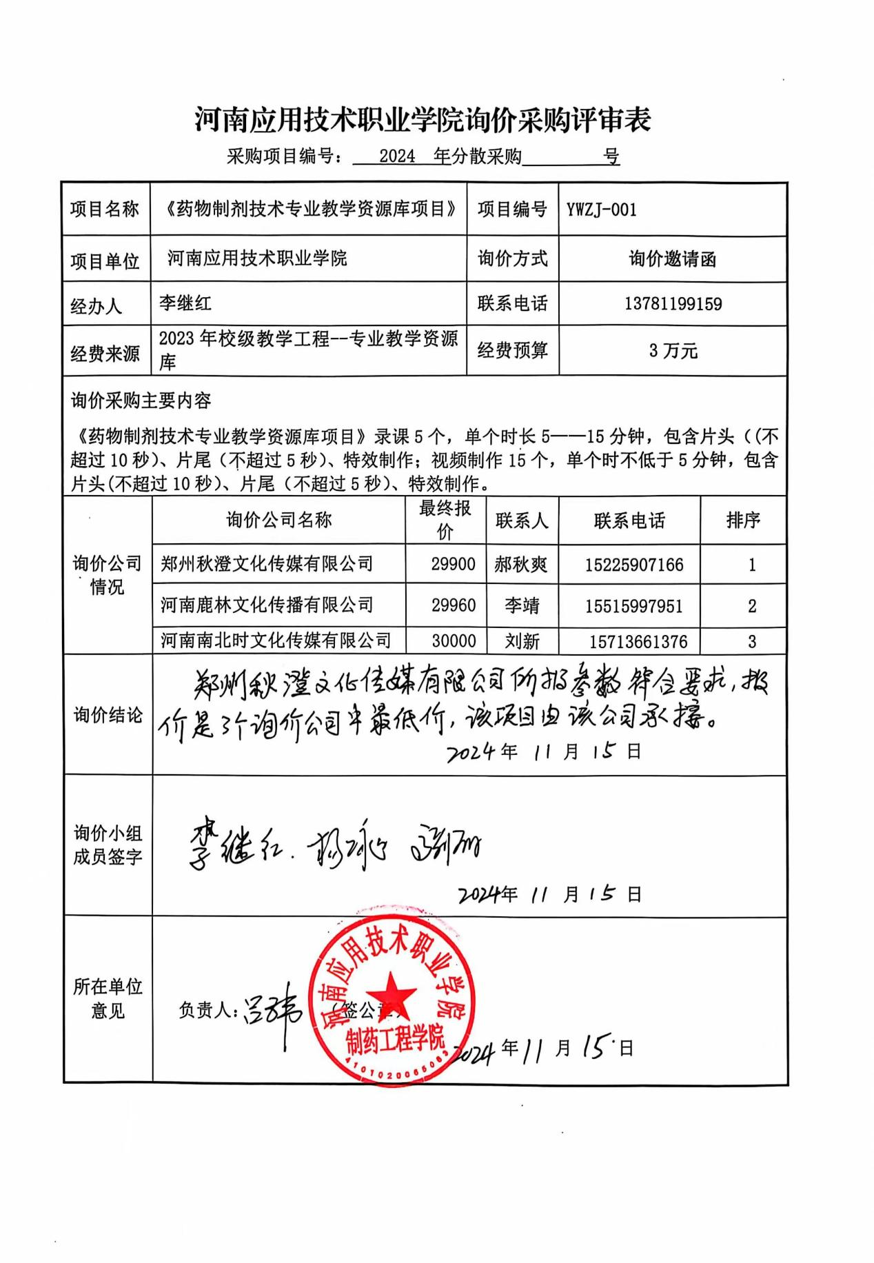 制药工程学院“药物制剂技术专业教学资源库项目,于2024年11月15日15: 00(北京时间),在beat365平台唯一官网开封校区(南院)301室,按照学校询价文件的规定,对3家供应商的响应文件进行了评审,现对评审结果进行公示。