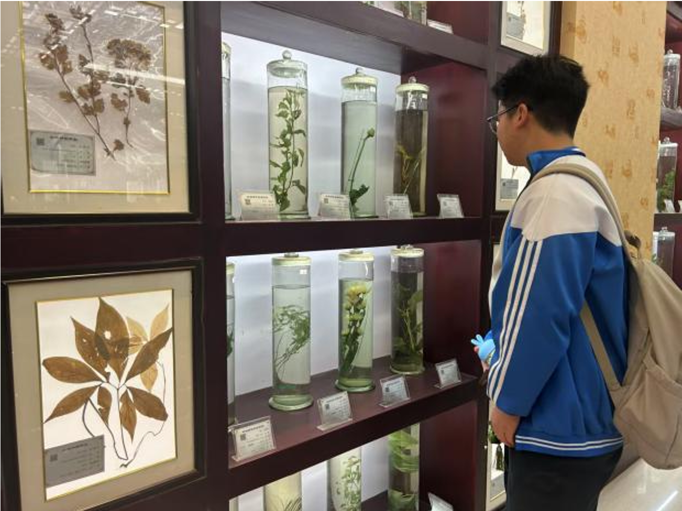随后,在志愿者带领下铁路中学师生参观了中医药博物馆和医药学院健康管理实训室。博物馆内丰富的中药标本,结合多媒体辅助展示,全面地展示了中医药的发展历程。在数字化体验区,师生通过全息设备沉浸式观看古老医案、药材生长等动态影像,感受中医药文化魅力。伴随博物馆讲解员深入浅出的讲解,使大家得以沉浸式地体验和领略中医药文化的博大精深。