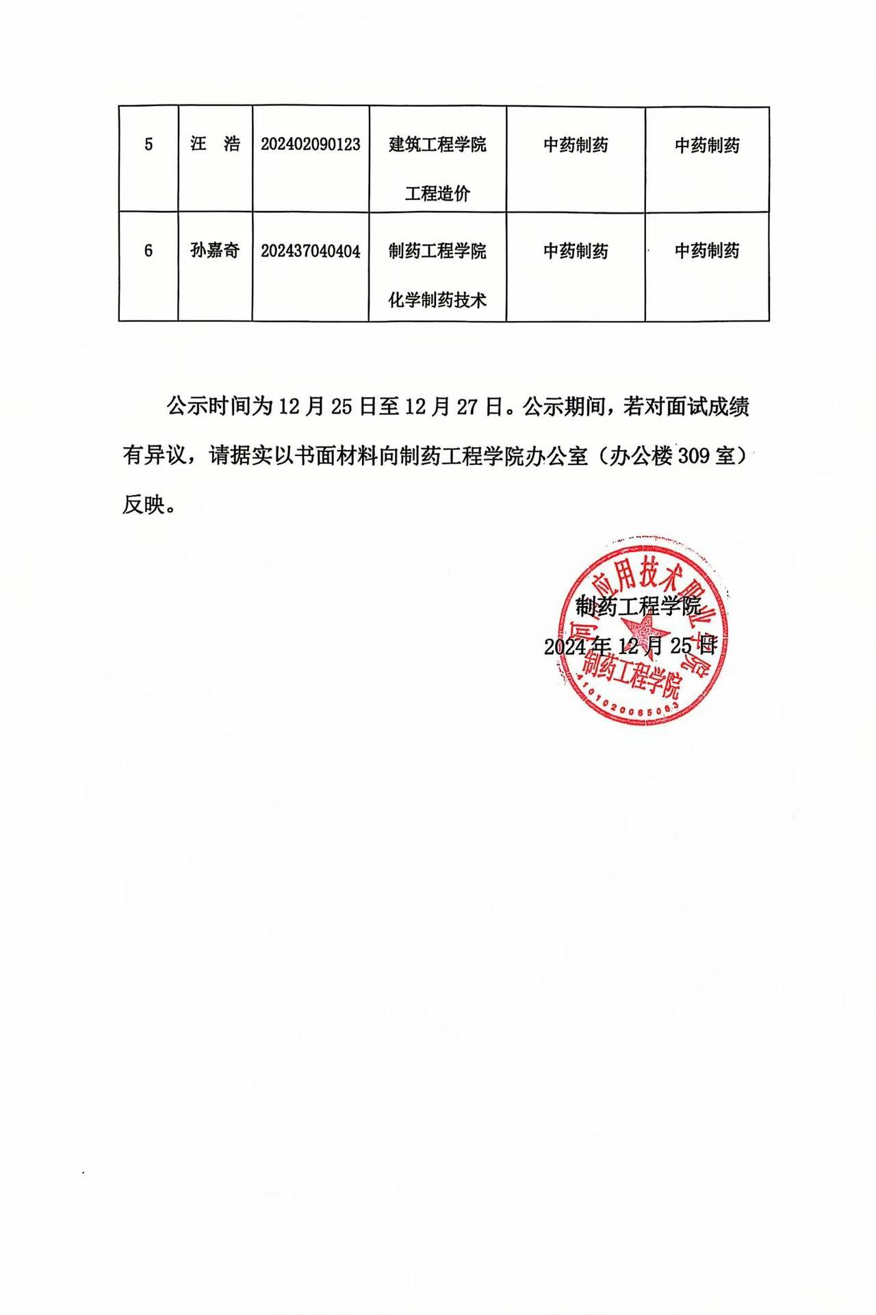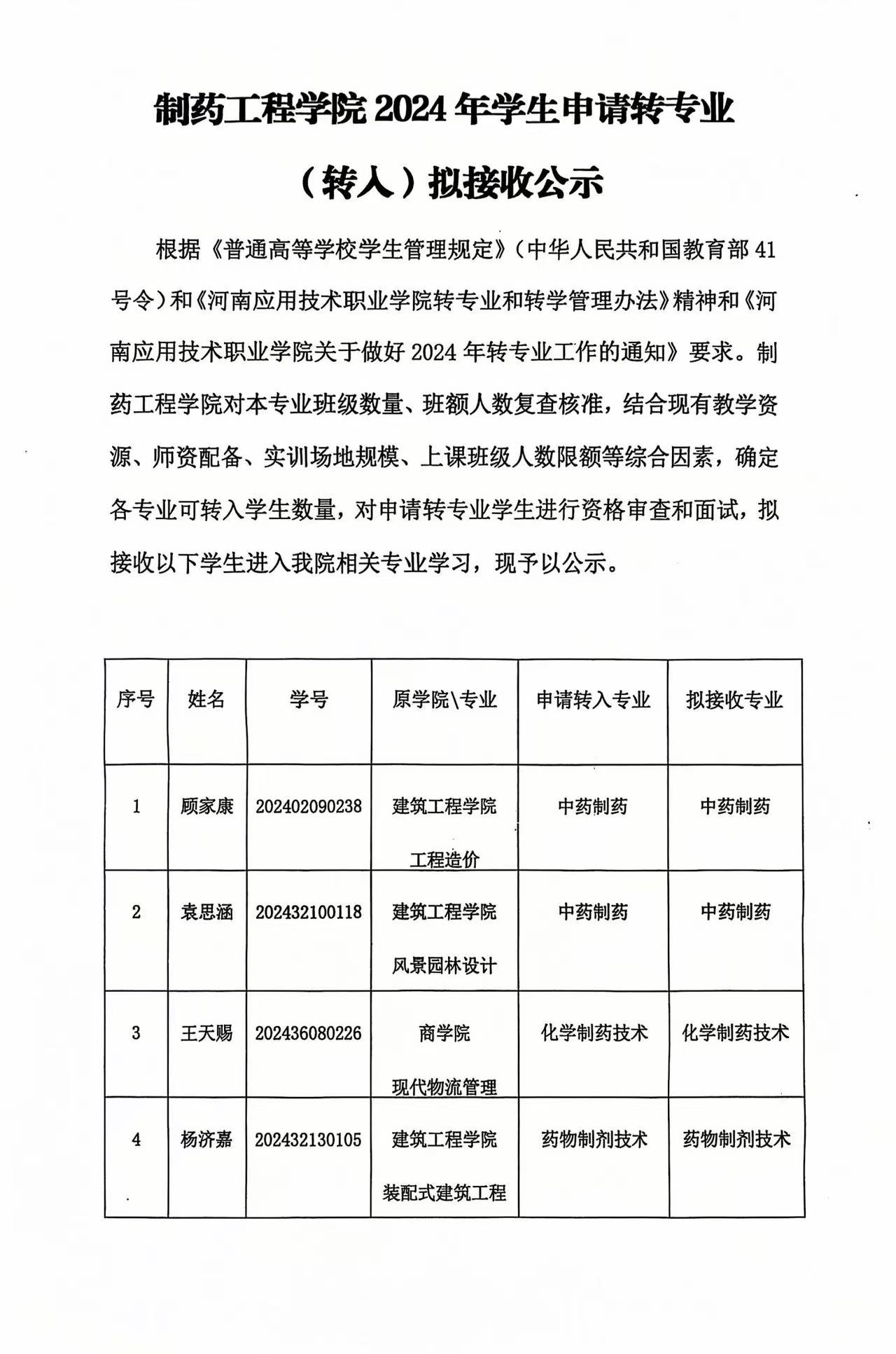 制药工程学院2024年学生申请转专业(转入)拟接收公示