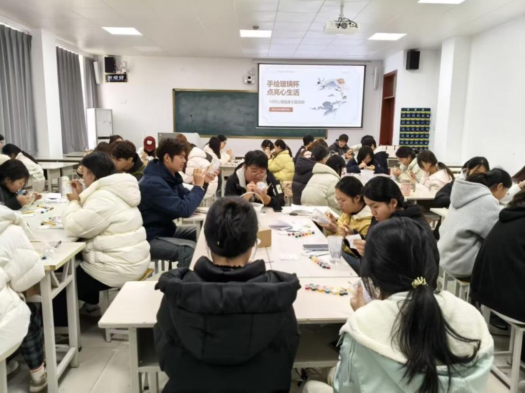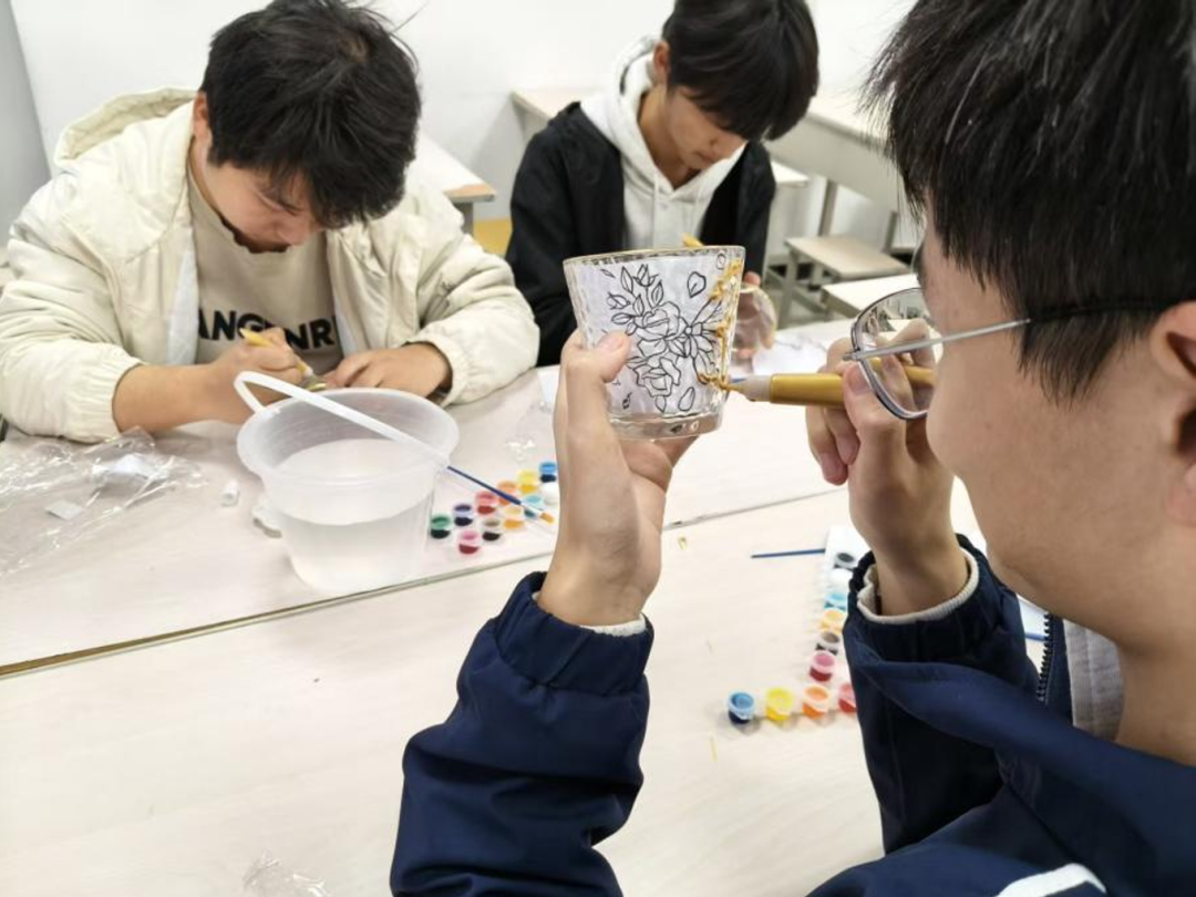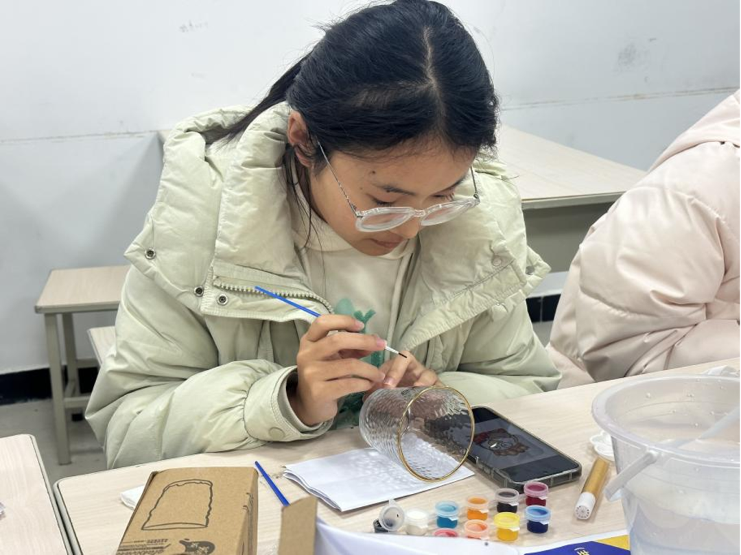 活动以手绘玻璃杯为核心载体,紧扣学生心理健康需求,学院为每位参与者精心准备了包含空白玻璃杯、颜料套装、调色盘、画笔等物品的创作包,全程不设固定风格与主题限制,鼓励同学们结合个人心境自由创作。大家充分发挥创意与想象,用明快的色彩传递乐观心态,用细腻的笔触勾勒内心感悟,用独特的图案寄托美好期许,在专注的创作中释放积累的负面情绪,让素净的玻璃杯成为承载心境与热爱的专属载体。