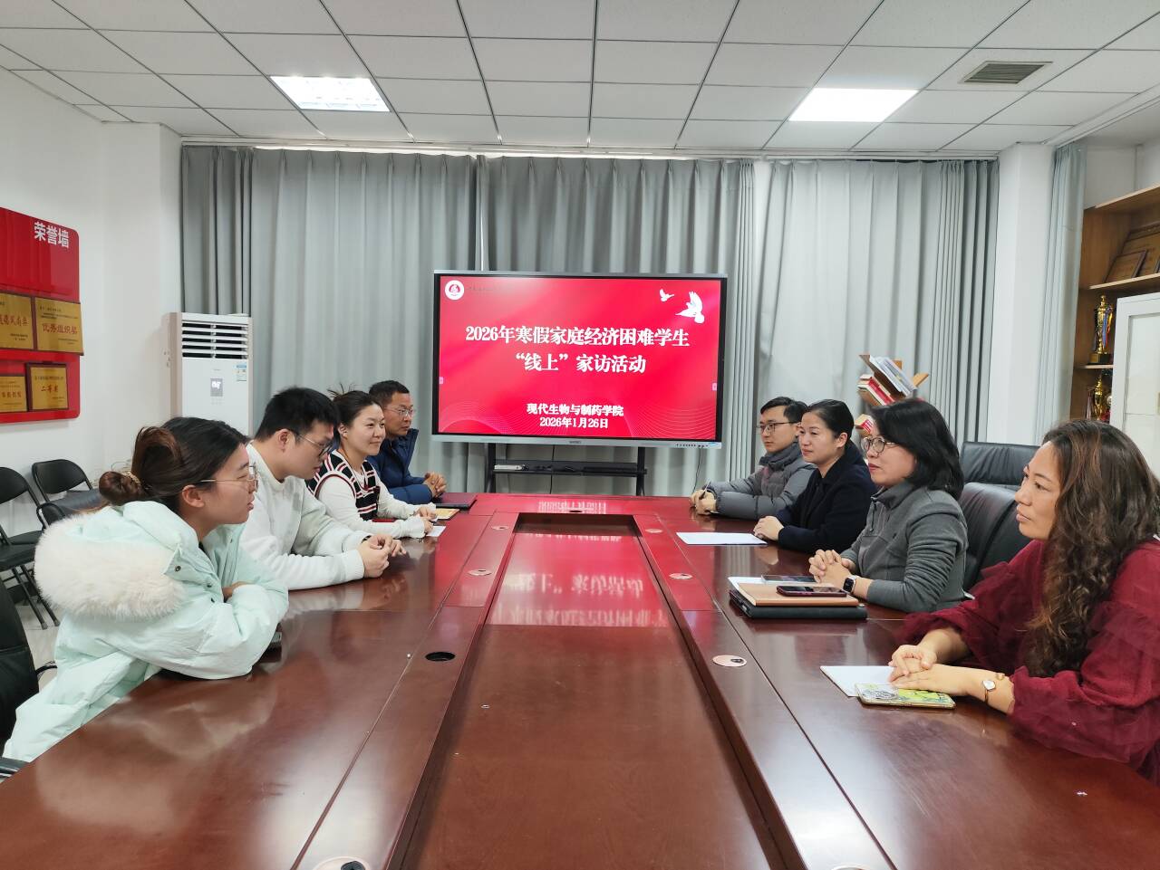 为扎实推进资助育人工作,切实关心家庭经济困难学生寒假生活状况,1月26日,beat365平台唯一官网以线上视频连线形式,开展2026年家庭经济困难学生“线上”家访活动。学院党总支书记梁艳、院长王湘妍、党总支副书记王俊永、副院长高莉丽、资助专员焦汉生及辅导员代表参与此次活动,与学生代表进行“零距离”线上交流。