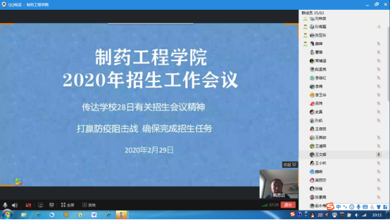 2020年2月29日上午10:00,制药工程学院通过QQ群视频,召开2020年招生工作会议。参会人员包括制药工程学院兼职招生队伍成员、专兼职教师、辅导员、实训管理员。