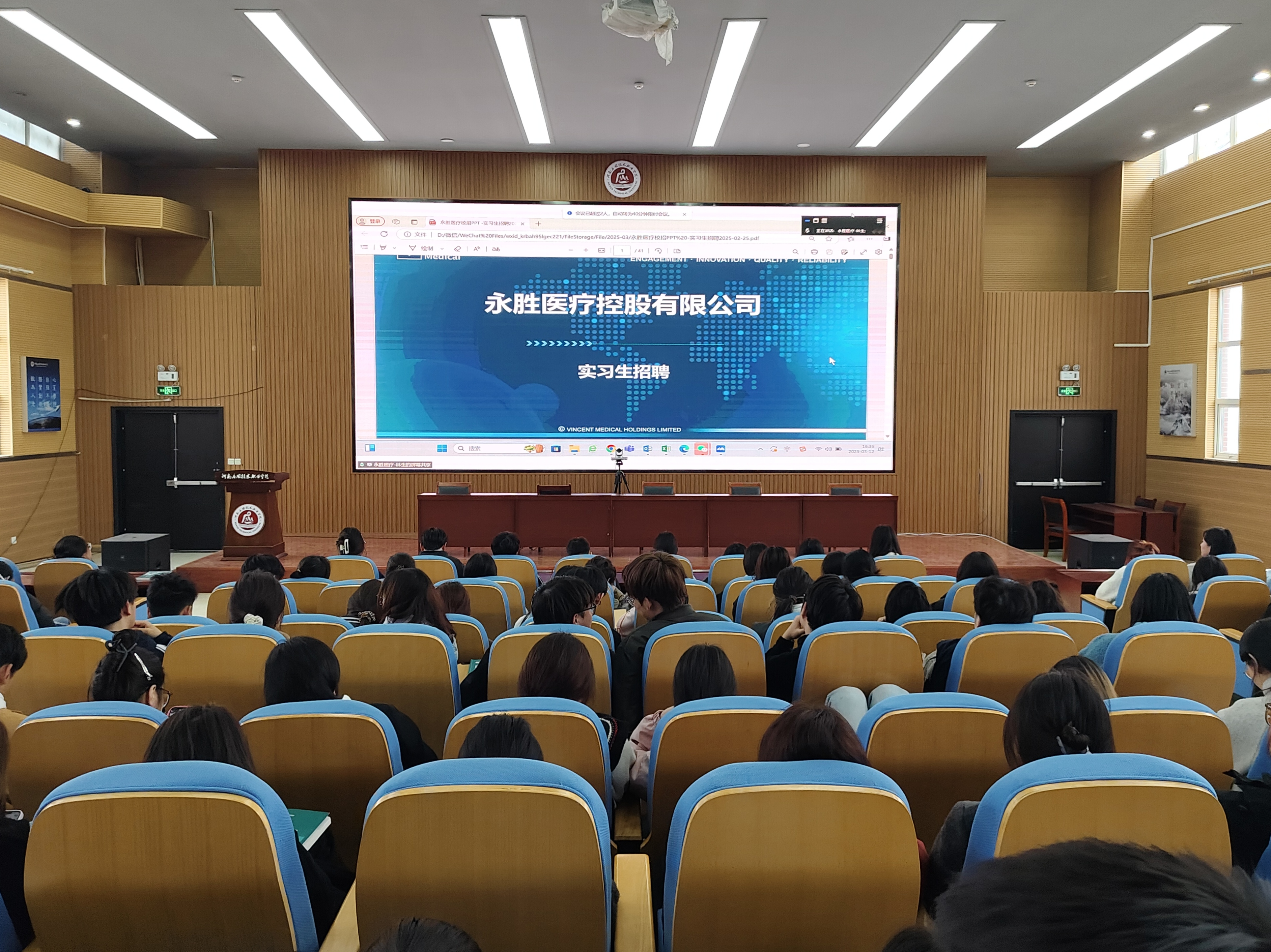 随后,两家企业分别开展宣讲。美好创亿医疗通过详实数据和案例,展示了企业在医药研发与生产制造领域的突出成就,并详细介绍了2025年校园招聘计划,强调对创新人才的重视。永胜宏基集团则重点介绍了核心业务、市场地位及完善的员工培养体系,为毕业生描绘了清晰的职业发展路径。