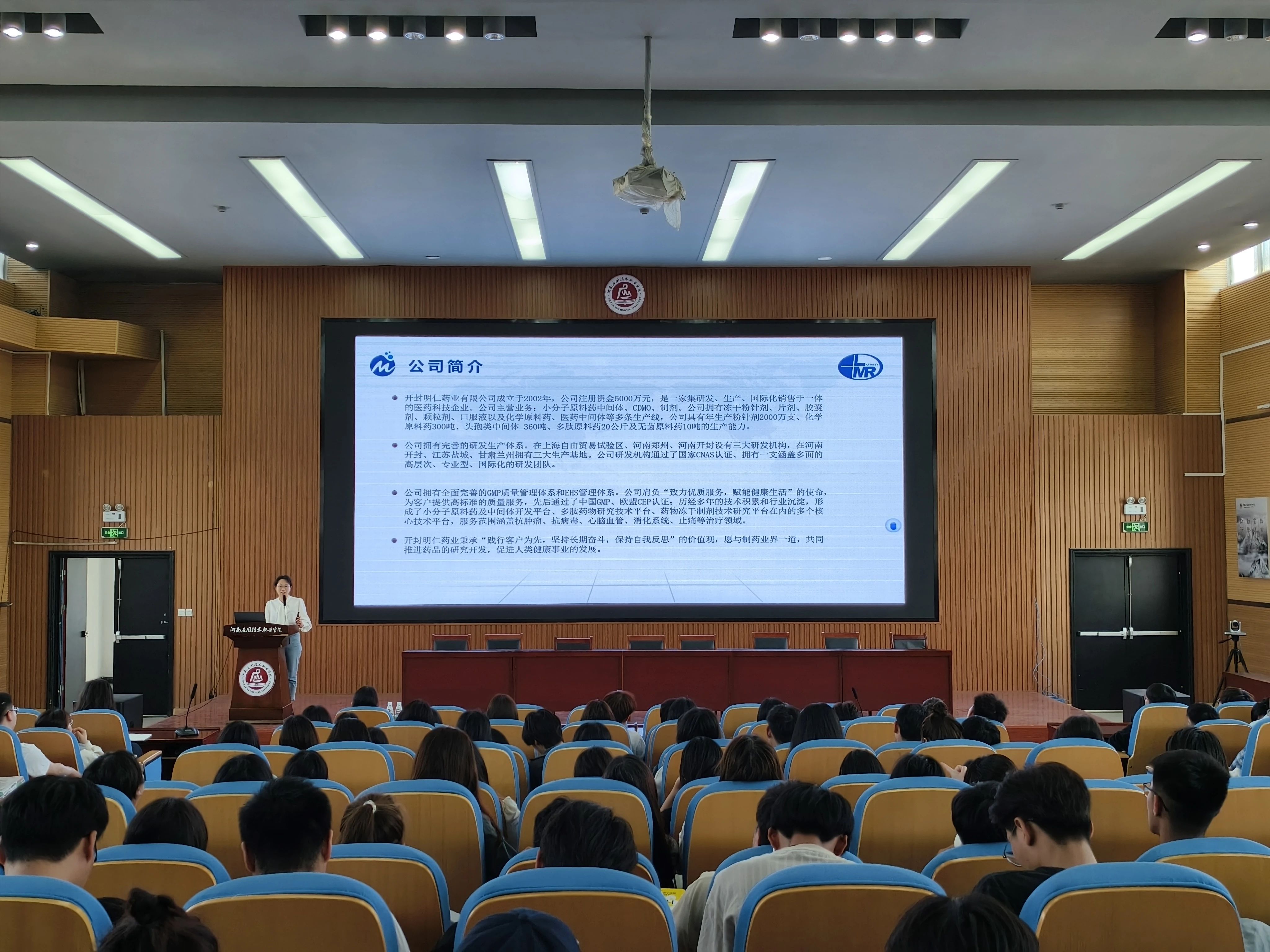 为贯彻落实党的二十大精神,拓宽我院毕业生就业渠道,把握优质就业岗位,切实落实推进就业相关工作,促进学院毕业生充分高质量就业,2024年4月12日制药工程学院邀请上海金不换兰考制药有限公司、开封明仁药业有限公司开展专场宣讲活动。上海金不换兰考制药有限公司人事经理蓝雨、开封明仁药业有限公司生产副总刘华分别带队莅临我院开展校招宣讲,学院党总支副书记白小茗、就业专员邢星、辅导员代东炎及学院2025届200余名毕业生参加宣讲会,宣讲会由邢星主持。